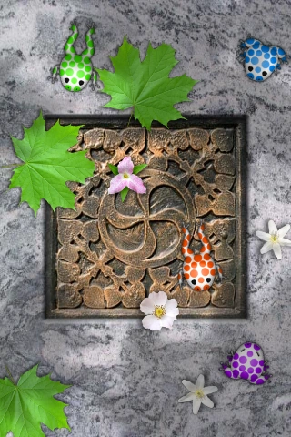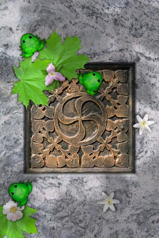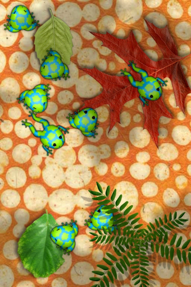 The frogs are made up of various green on green designs. |