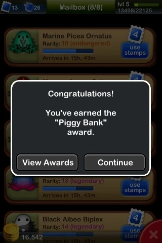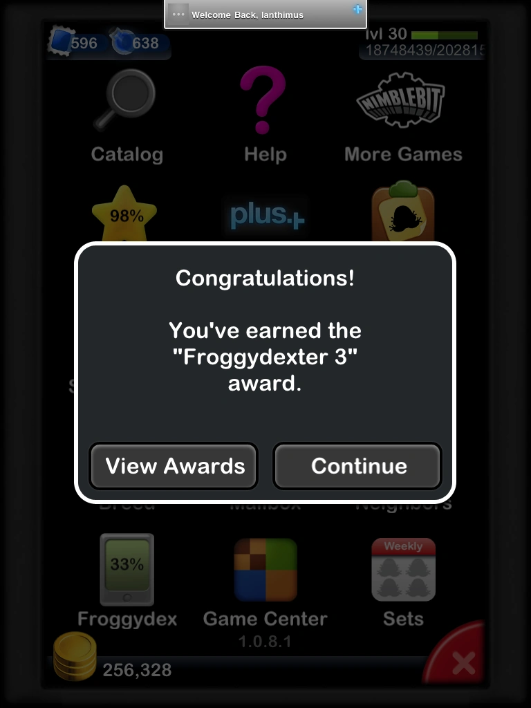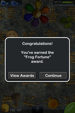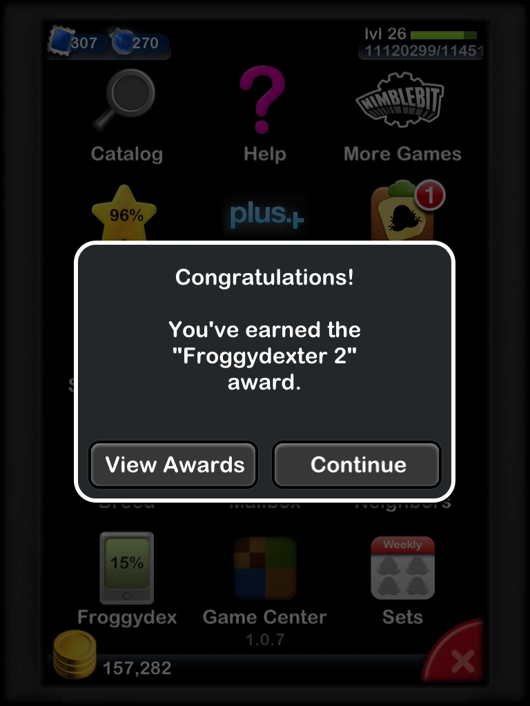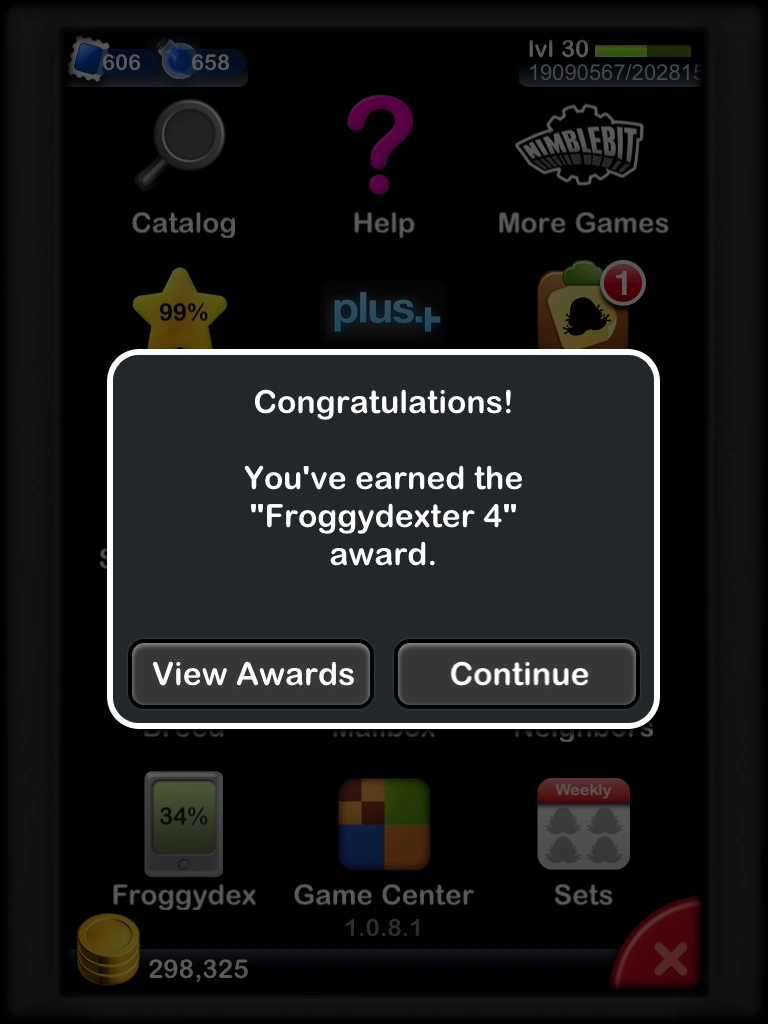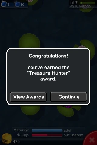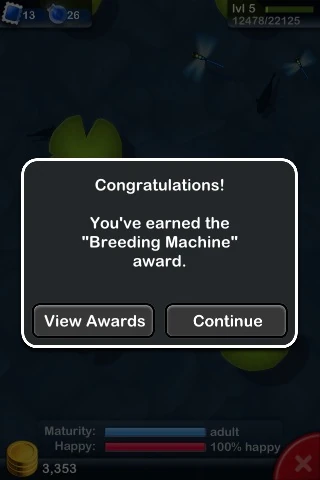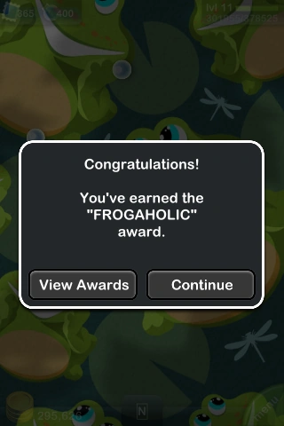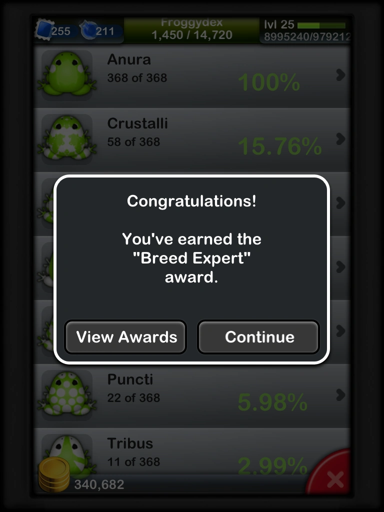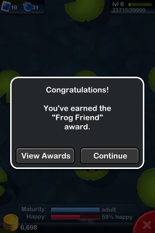 Awards are earned by breeding frogs, amassing coins, and collecting frogs in your Froggydex. Experience points are awarded as soon as the conditions are achieved. Most frog combination awards require the listed frogs to be in the same habitat. A user's list of awards won and not yet won can be viewed through the Awards menu. Each award can be earned only once.